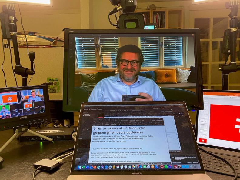 Han sier han har gjenbrukt videokameraer, nettbrett og annet han hadde fra før, og bare investert rundt 6-7.000 kroner i oppsettet på sitt eget hjemmekontor. I stedet for 200.000, som han mener dette ville kostet for ikke så lenge siden. Og han har fått et oppsett som lar ham ta regi over hva han sender, være tilstede med de han snakker med, og samtidig ha oversikt over det andre arbeidet sitt – i langt større grad enn de fleste får til.